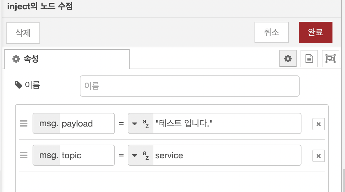 4-3) mqtt in의 경우 보통 out 오브젝트를 수정하면 같이 수정되는데 혹시 안돼 있으면 동일하게 설정하면 된다.