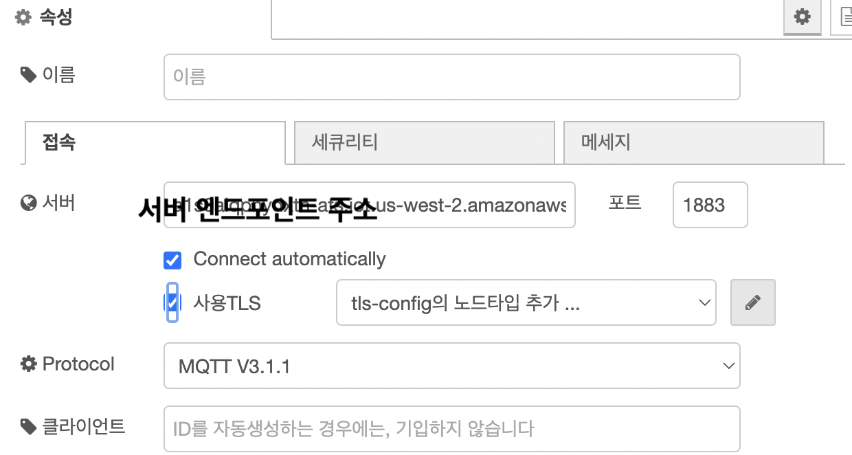 서버 엔드포인트를 적어 두고 TLS사용을 클릭한다. 여기서 포트 번호는 8883을 사용한다.(잘못된 걸 찾느라 힘들었다.)