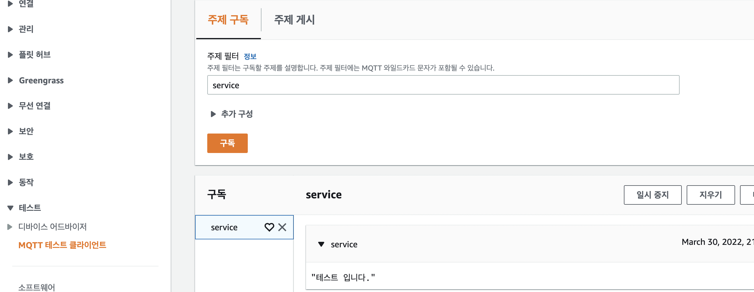 AWS에서도 확인 할 수 있는데 테스트에 mqtt 테스트 클라이언트에 가서 같은 주제를 구독 해 두면 아래처럼 메시지가 발생하는 것을 볼 수 있다.