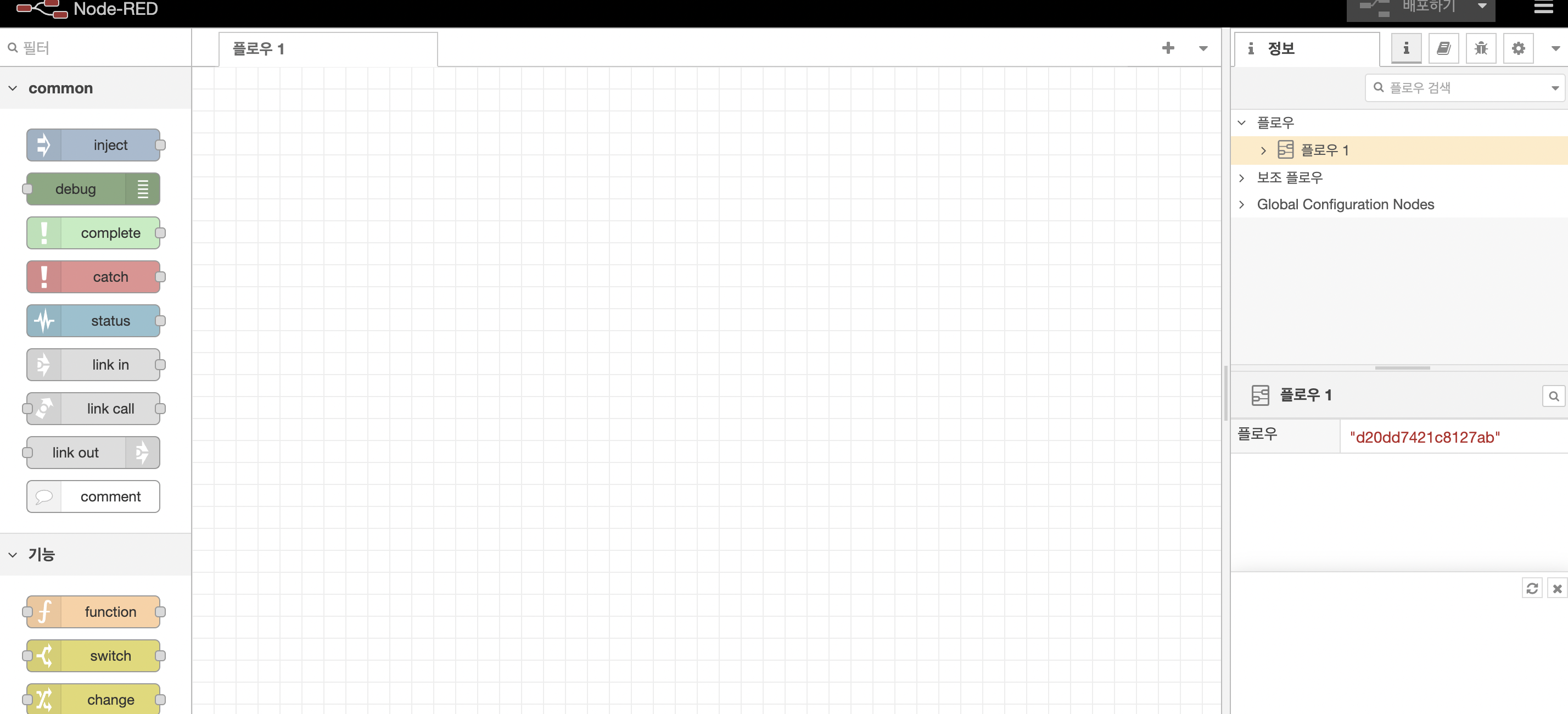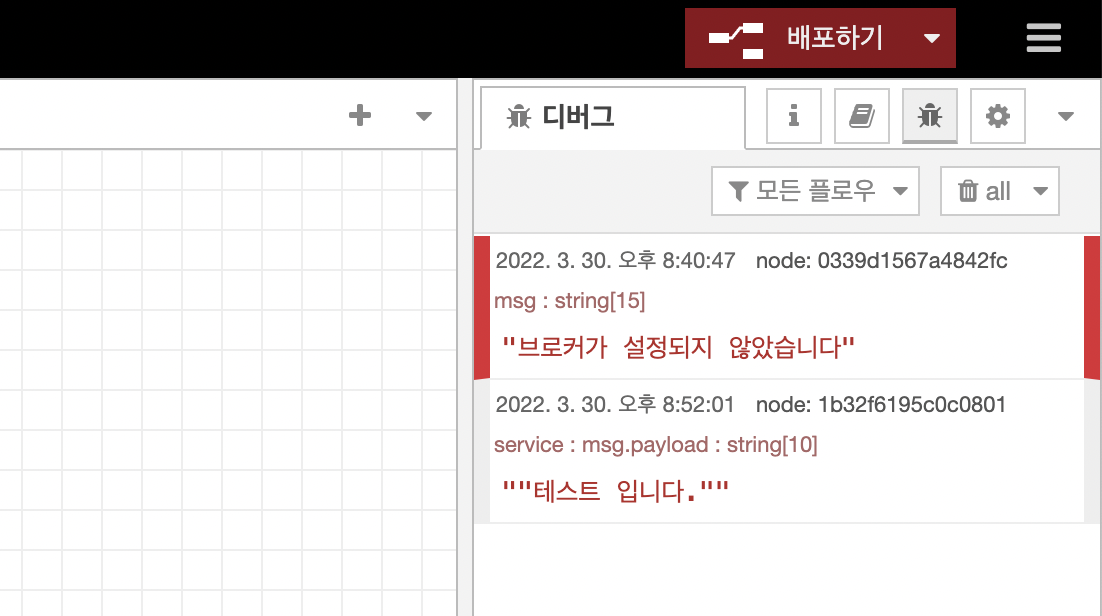 이제 다 왔다. Node-red 오른쪽 상단의 배포하기를 누른다.
