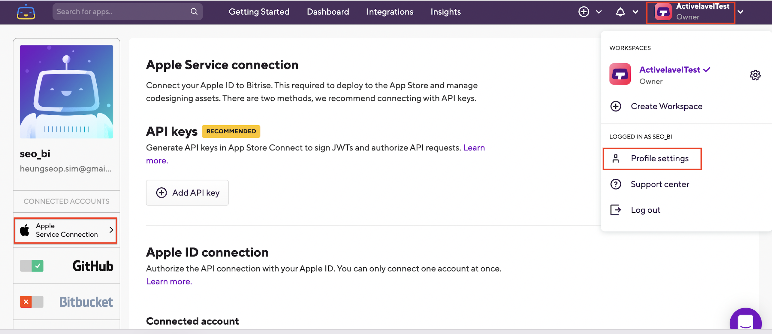 Bitrise에서 오른쪽 상단을 누르고 프로필 세팅 누르고