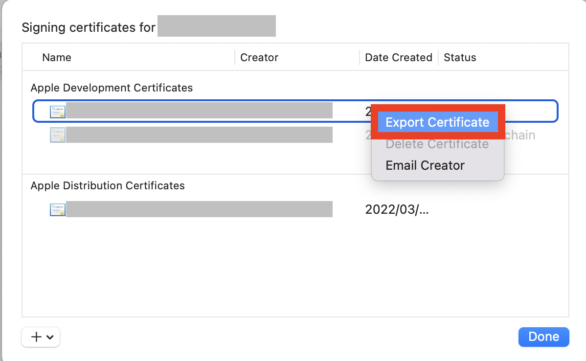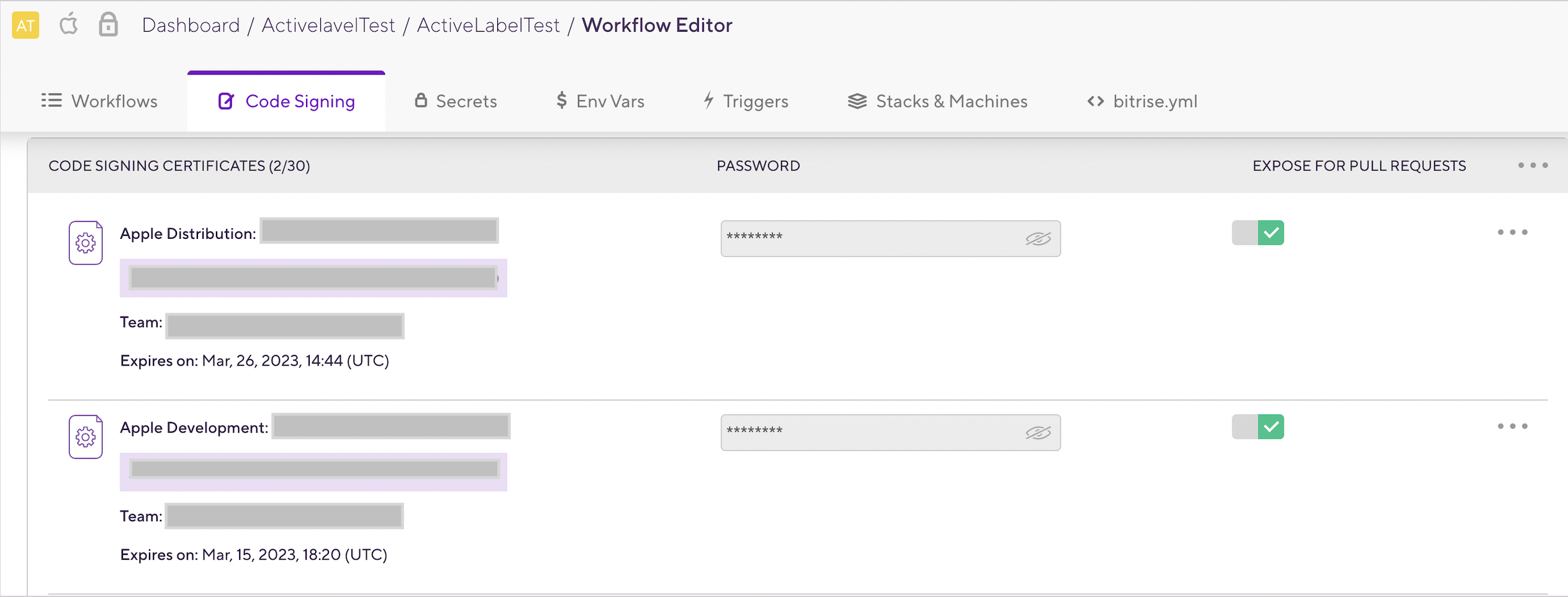 export 할 때, 작성했던 비밀번호를 기억해 둬야 하고 다시 다운로드한 파일을 Edit WorkFlows의 Code Signing 탭에 업로드한다.