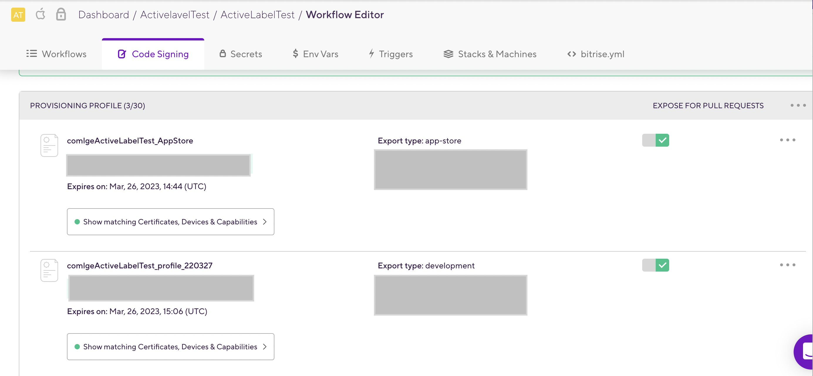 2. bitrise 서버에 빌드에 필요한 Profile 이 없다.