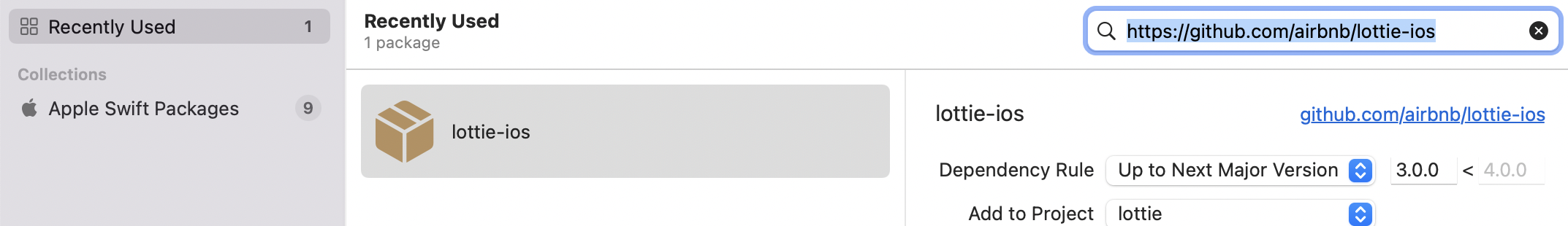 lottie Project -> package Dependencies으로 들어가서 하단의 + 를 선택하고 lottie를 검색해서 바로 설치할 수 있다.