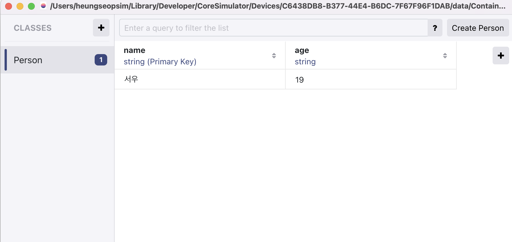 실제로 Simulator 에 저장된 db data를 조회 할 수 있다.