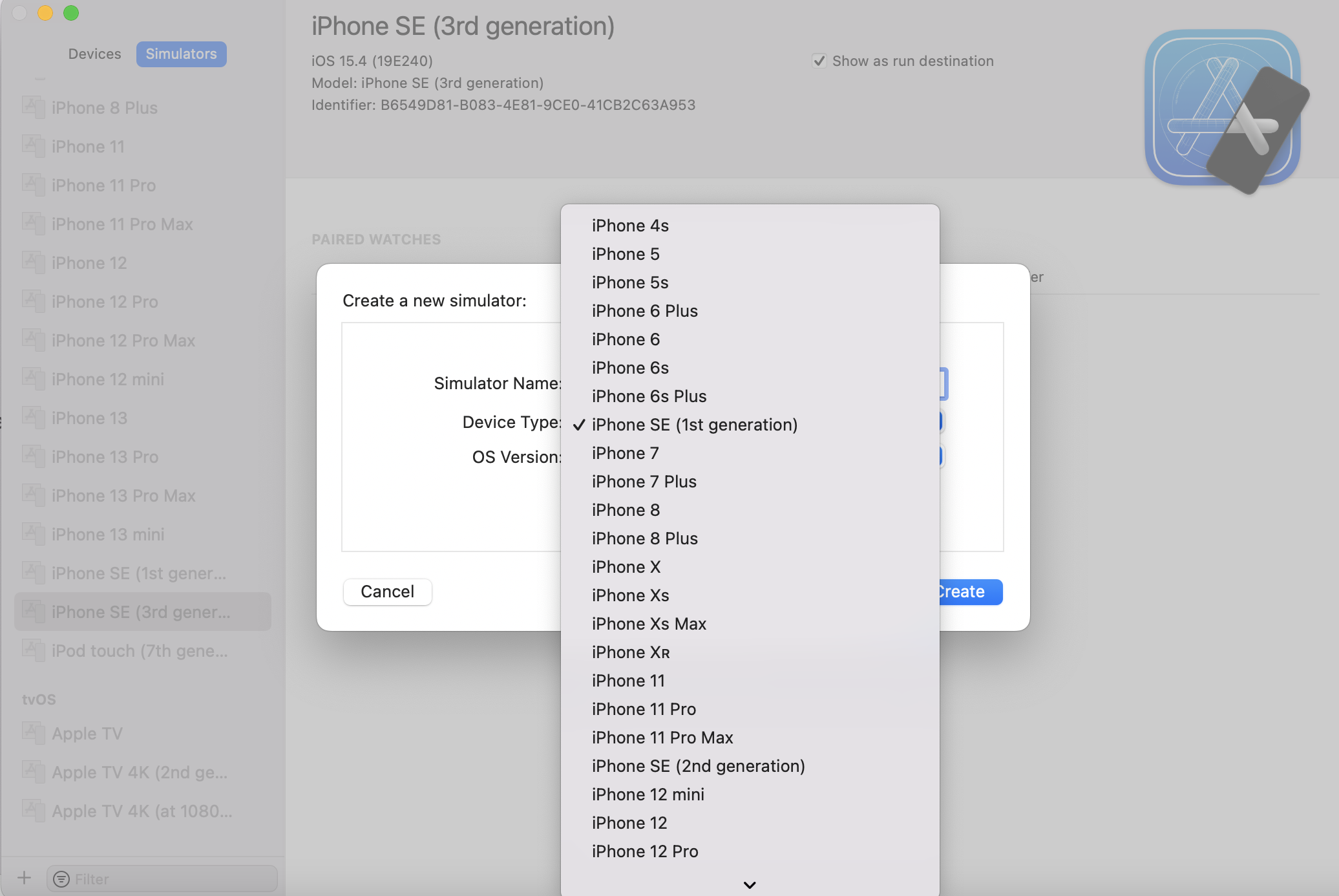 2. 좌측 하단의 + 버튼을 눌러서 iphone se (1st) 를 추가 한다. 화면 중간에도 +가 있는데 전체 창의 좌측 하단 이다. 선택하고 create 누르면 이제 시뮬레이터 리스트에 보여진다.