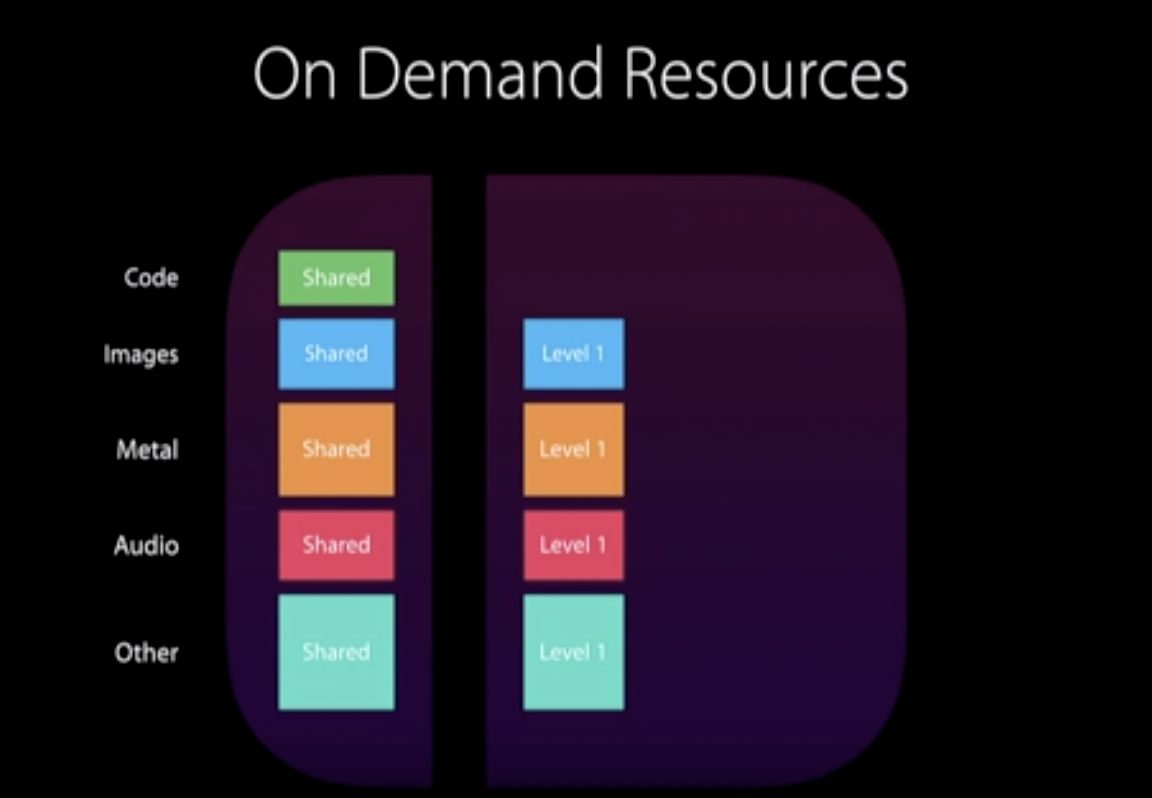 예를 들어 게임에서 사용자가 레벨 1이라면 레벨 1에 해당하는 화면이나 소리 리소스 들만 들고 있으면 되고, 나머지 리소스는 앱스토어가 가지고 있다가 진행하면서 다운로드 받는다 (On Demand Resources)